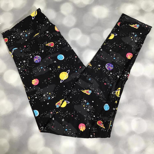 Single Print - Leggings - Colorful Outer Space Planets and Stars Print on Black